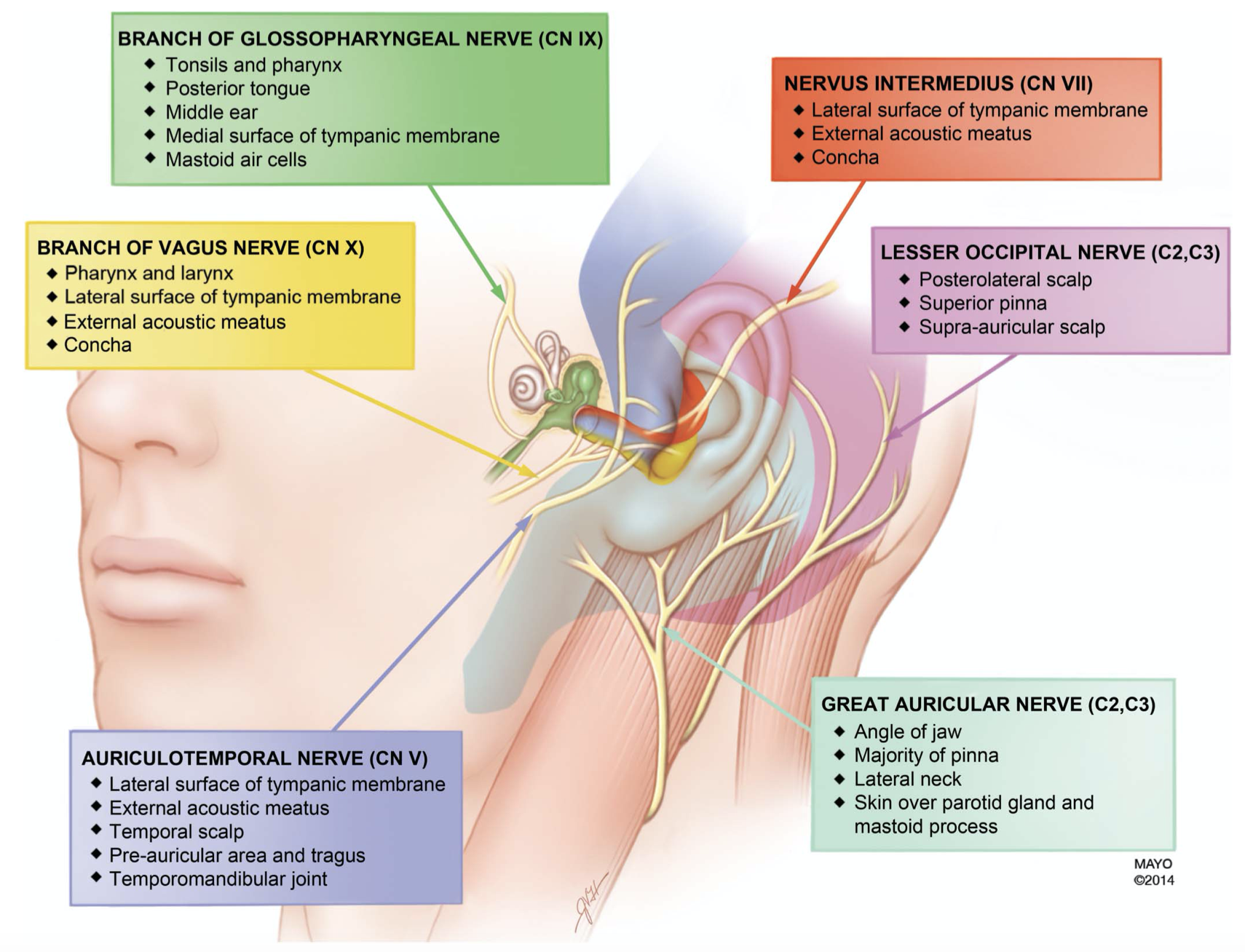 Ramsay Hunt症候群の理解には解剖が重要です。外耳道は顔面神経、迷走神経、三叉神経が支配しています。